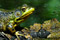 A frog sits on a log as it stares into the water at its reflection near the Dead River in Marquette County.