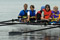 The Marquette Community rowing team paddles slowly through a mooring area as a fog falls over Lake Superior in Marquette, Michigan during a community learn to row day.